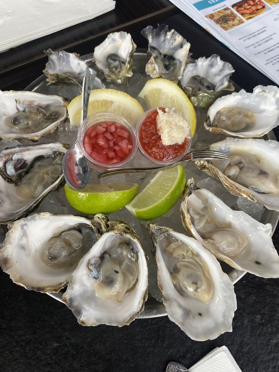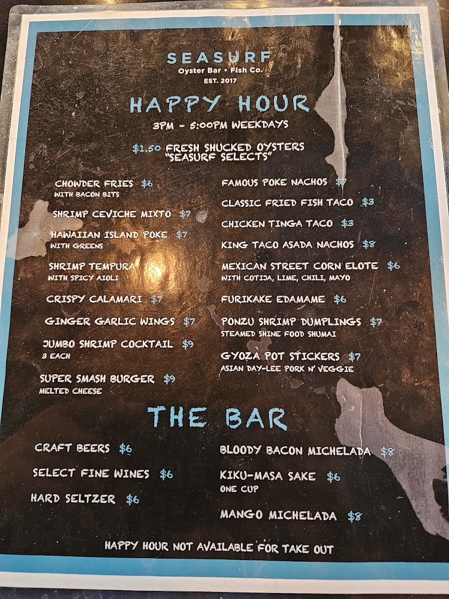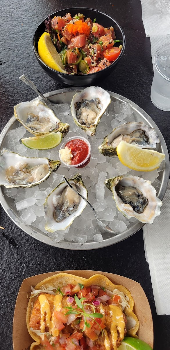 We went for Happy Hour and had got fish tacos, fried calamari, poke salad, cheeseburger, garlic wings, chowder fries, and oysters. The fish tacos were nice and crispy but the fish was also soft. Fried calamari was crispy but it was salty. Poke salad tasted good and was soft. Chowder fries were good and so was the garlic wings. Oysters were very refreshing and had a nice sauce with it. Overall, food and service was good and would reccomend.